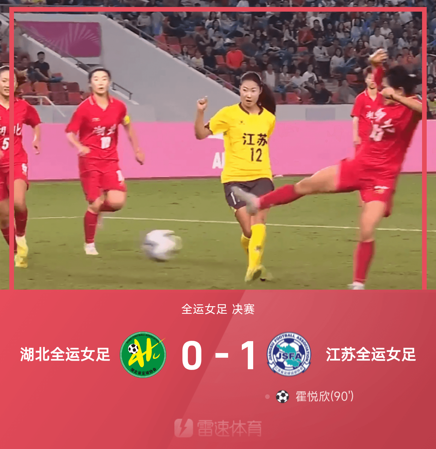 雷速體育11月15日訊 第十五屆全運(yùn)女足決賽,江蘇全運(yùn)女足1-0戰(zhàn)勝湖北全運(yùn)女足,霍悅欣第90分鐘上演絕殺。全場(chǎng)比賽,霍悅欣在第90分鐘破門絕殺。江蘇女足獲得本屆全運(yùn)會(huì)金牌,湖北女足屈居亞軍。