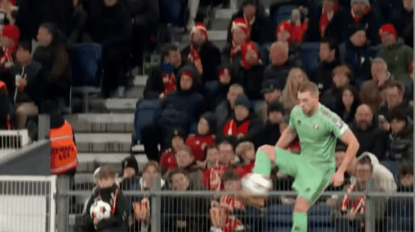 4’埃里克森主罰任意球直接射門,皮球被白俄羅斯人墻擋出