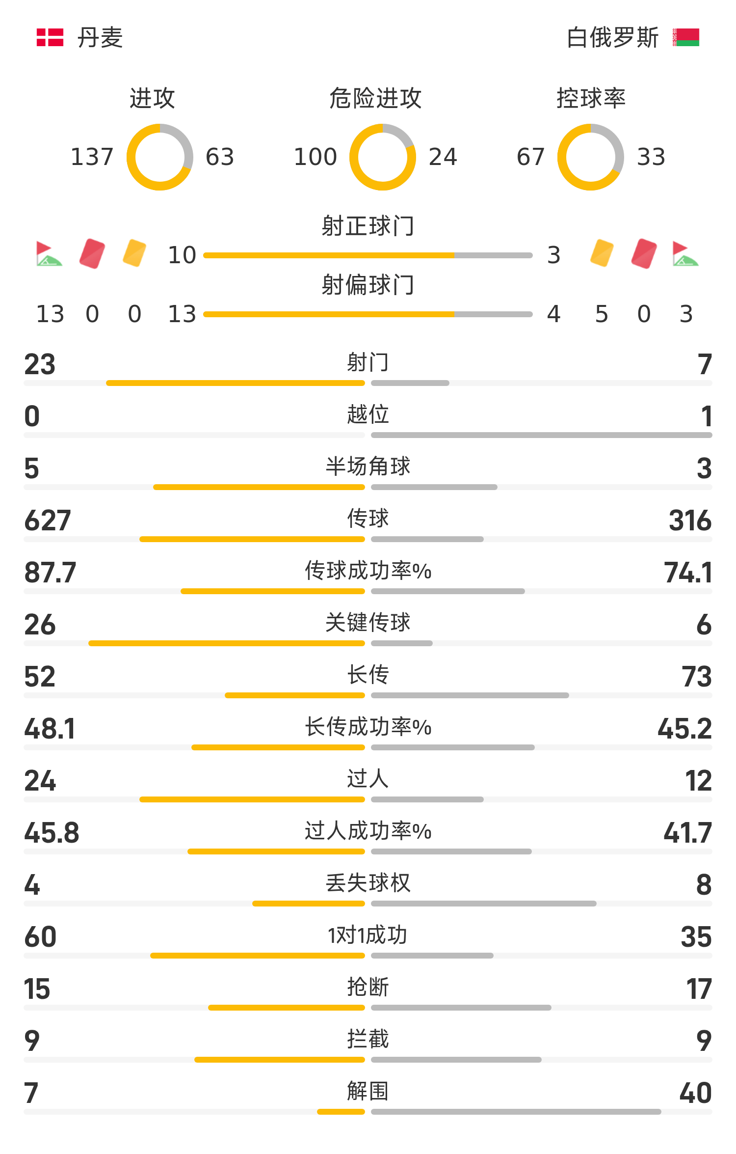 雷速體育11月16日訊 26賽季世歐預(yù)分組賽C組第9輪,丹麥對陣白俄羅斯。第11分鐘,達姆斯高禁區(qū)外轟出超級世界波,丹麥取得夢幻開局。下半時風云突變,白俄羅斯在第62分鐘和第65分鐘利用格羅米科的傳射建功,瞬間將比分反超為2-1。第79分鐘,多爾古傳中,伊薩克森爆射破門,兩隊再度回到同一起跑線。最終丹麥在主場以2-2戰(zhàn)平白俄羅斯,由于同組的蘇格蘭作客不敵希臘,丹麥仍然占據(jù)直接晉級世界杯決賽圈的優(yōu)勢位置。