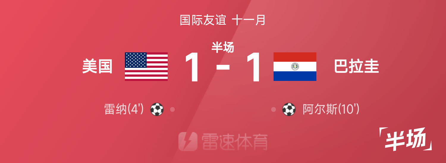 雷速體育11月16日訊 25賽季國際友誼十一月,美國主場迎戰(zhàn)巴拉圭。上半場,雷納開場閃擊破門,阿爾斯5分鐘之后扳平比分,此后雙方十分沉悶均未能威脅到對手球門,半場戰(zhàn)罷,雙方比分暫為美國1-1巴拉圭。