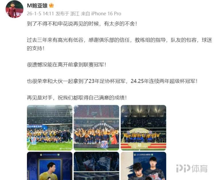 鮑亞雄在個人微博中寫道:到了不得不和申花說再見的時候,有太多的不舍!過去三年來有高光有低谷,感謝俱樂部的信任,教練組的指導(dǎo),隊友的包容,球迷的支持!很遺憾沒能在離開前拿到聯(lián)賽冠軍!也很榮幸和大伙一起拿到了23年足協(xié)杯冠軍,24、25年連續(xù)兩年超級杯冠軍!再見是對手,祝我們都取得自己滿意的成績! ???