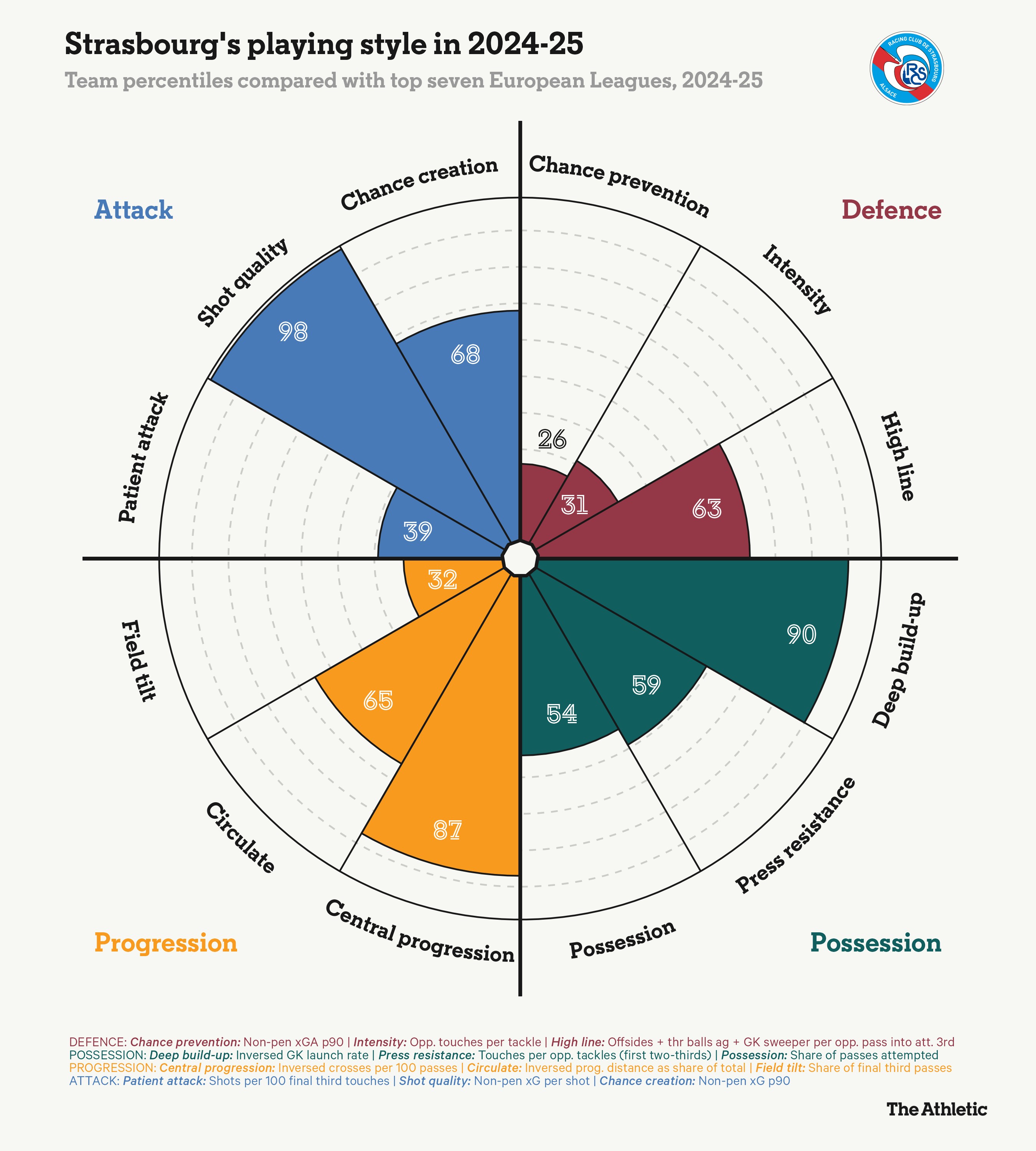 當(dāng)我們以2024-25賽季(上一個(gè)完整賽季)的數(shù)據(jù),將他們的比賽風(fēng)格與歐洲前七聯(lián)賽對(duì)比時(shí),這種方法得到了體現(xiàn)。請(qǐng)注意,他們?cè)诒痉饺齾^(qū)的傳球是多么深思熟慮(深度組織,99分制中的90分),以及他們多么希望通過球場(chǎng)中路推進(jìn)皮球(中路推進(jìn),99分制中的87分),以此支撐其前場(chǎng)的進(jìn)攻推進(jìn)方式。
