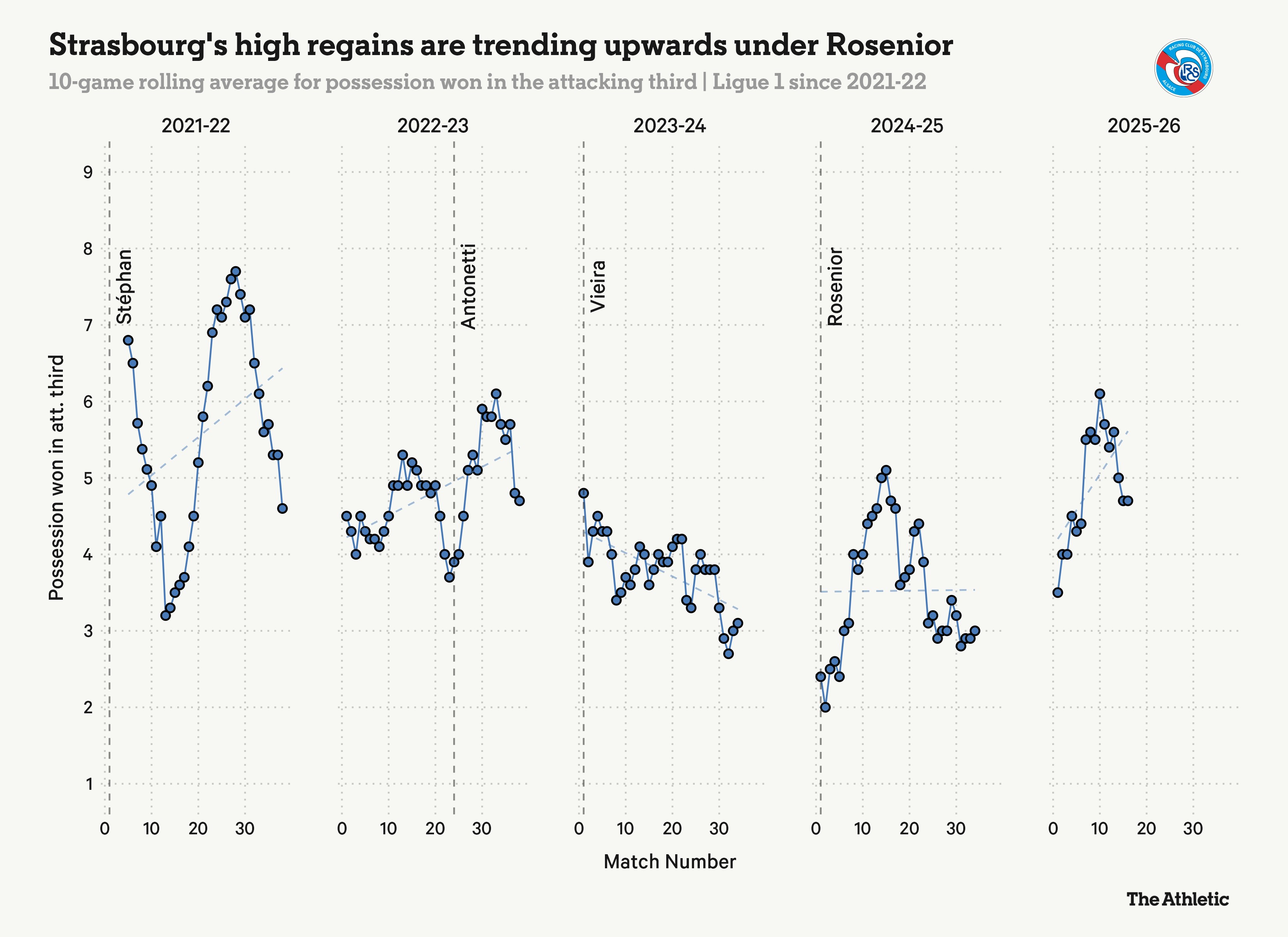 這一點(diǎn)清晰地體現(xiàn)在羅塞尼爾2024年上任以來的更廣泛趨勢(shì)中,其前任帕特里克-維埃拉執(zhí)教時(shí)期的高位奪回球權(quán)率較低。在上賽季末趨于平穩(wěn)后,本賽季斯特拉斯堡在進(jìn)攻三區(qū)奪回球權(quán)的次數(shù)呈上升趨勢(shì)——在2025-26賽季的法甲中,只有巴黎圣日耳曼的高位奪回球權(quán)后形成射門的次數(shù)(5次)比他們更多。