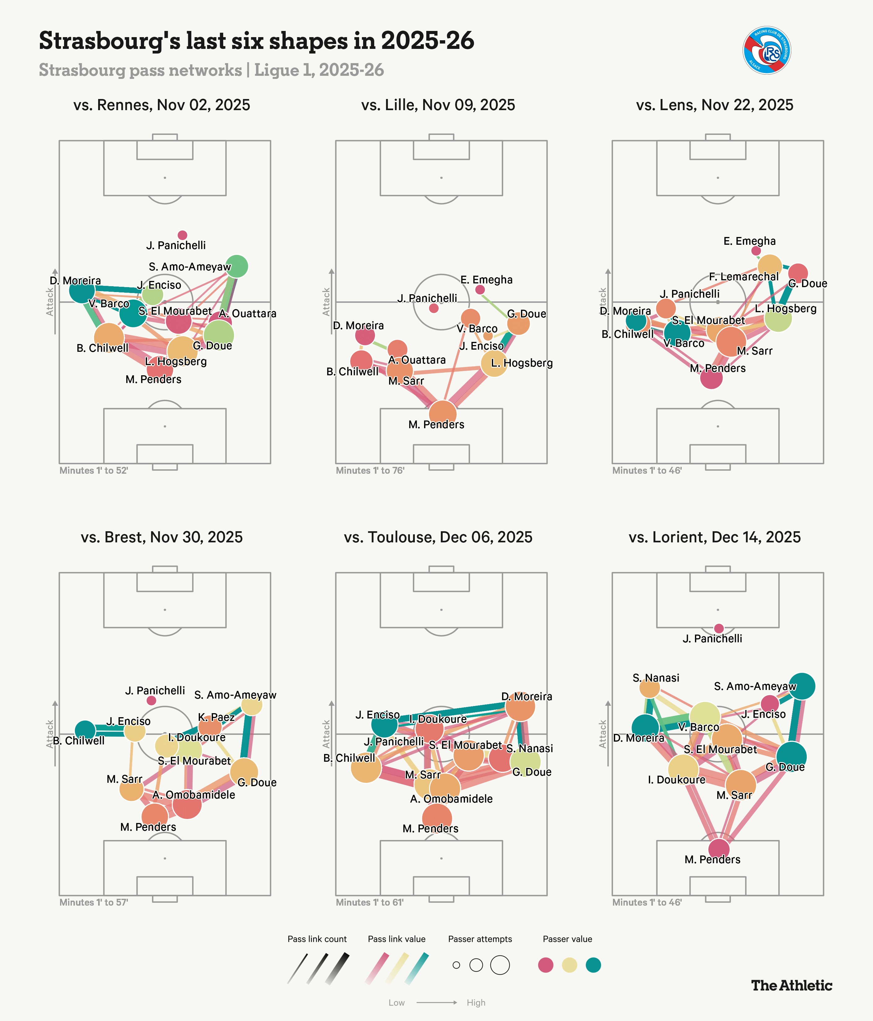 斯特拉斯堡可以根據(jù)對(duì)手切換陣型,其多變性允許羅塞尼爾在通常為3-4-2-1的三后衛(wèi)體系,與4-3-3或4-2-3-1的四后衛(wèi)體系之間交替。這在下面的近期傳球網(wǎng)絡(luò)圖中得以體現(xiàn)。