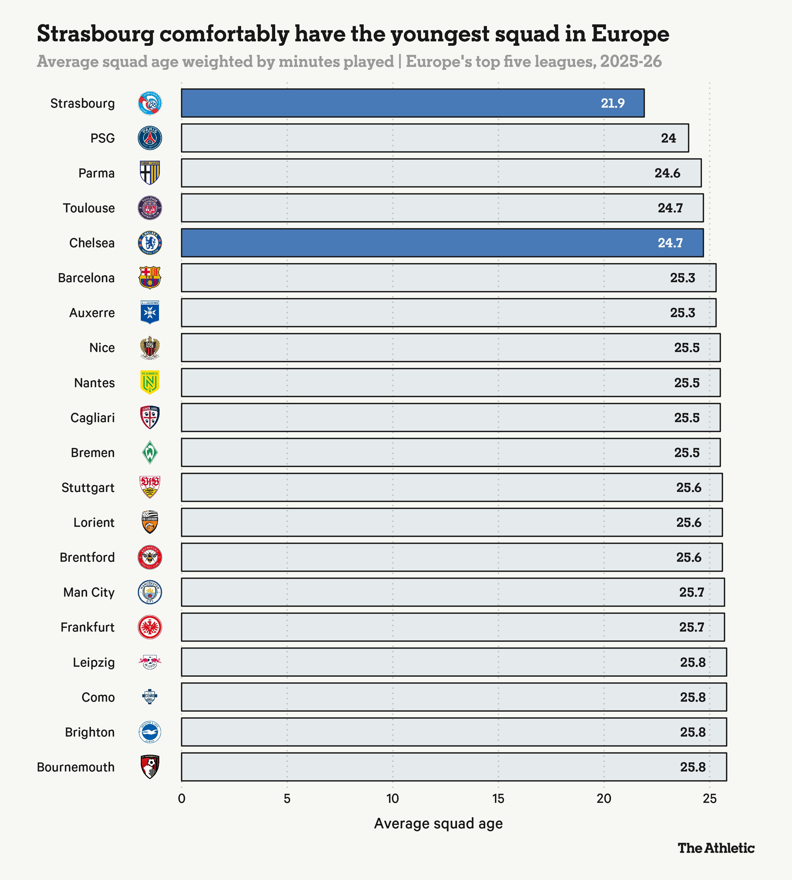 切爾西球迷已經(jīng)看到了BlueCo商業(yè)模式的效果,即投資年輕天才并在他們成長過程中提升其價(jià)值,但斯特拉斯堡將這一理念提升到了另一個(gè)層次。平均年齡21.9歲,斯特拉斯堡輕松擁有歐洲五大聯(lián)賽中最年輕的陣容——比最接近的俱樂部(巴黎圣日耳曼,24歲)年輕兩歲多。