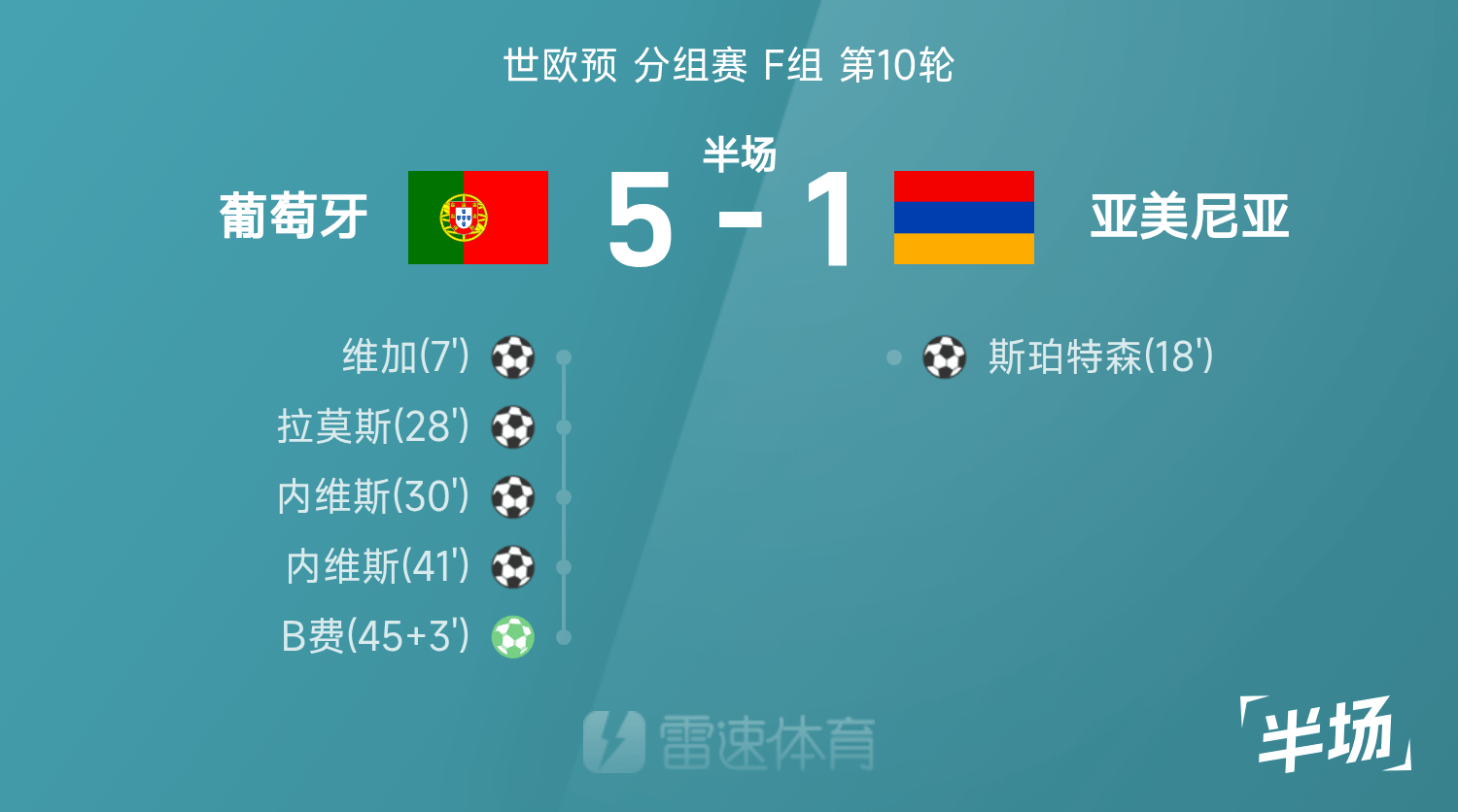 雷速體育11月16日訊 26賽季世歐預(yù)分組賽F組第10輪,葡萄牙迎戰(zhàn)亞美尼亞。半場戰(zhàn)罷,雙方比分暫為葡萄牙5-1亞美尼亞,內(nèi)維斯上演梅開二度。