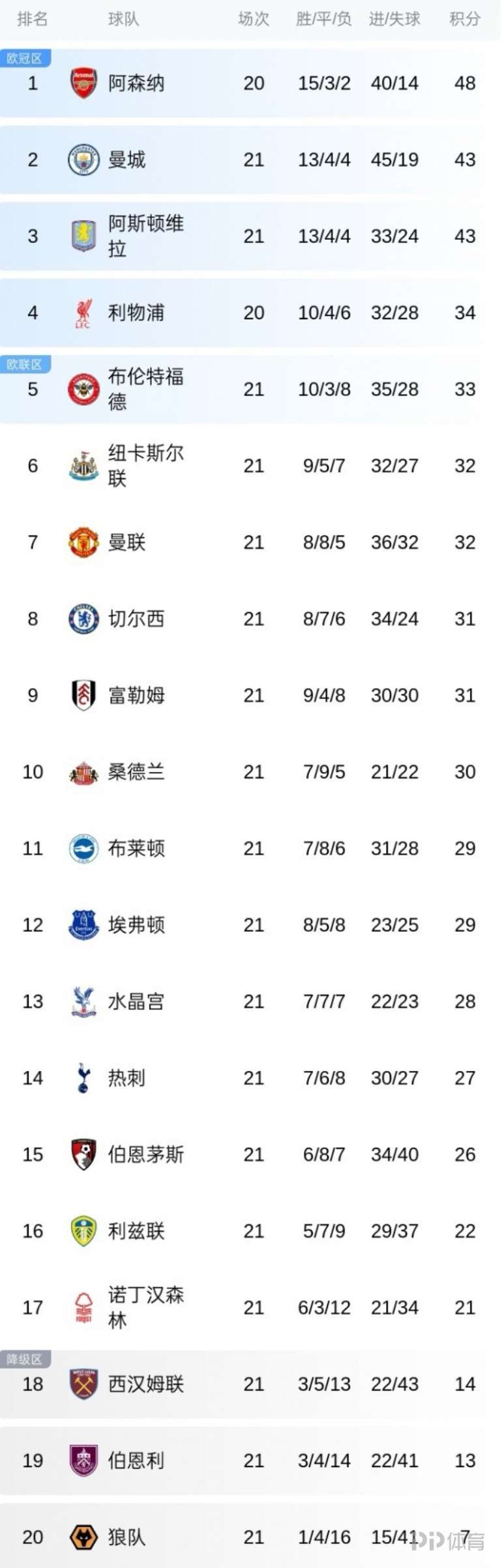 英超第21輪結(jié)束多場(chǎng)對(duì)陣,水晶宮0-0維拉,富勒姆2-1切爾西,布倫特福德3-0桑德蘭,伯恩茅斯3-2熱刺,曼城1-1布萊頓,埃弗頓1-1狼隊(duì),伯恩利2-2曼聯(lián),紐卡4-3利茲聯(lián)。