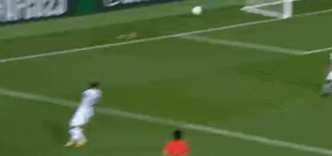 第24分鐘,李鎮(zhèn)全禁區(qū)左側(cè)倒三角回敲,楊希門前半轉(zhuǎn)身打門高出橫梁