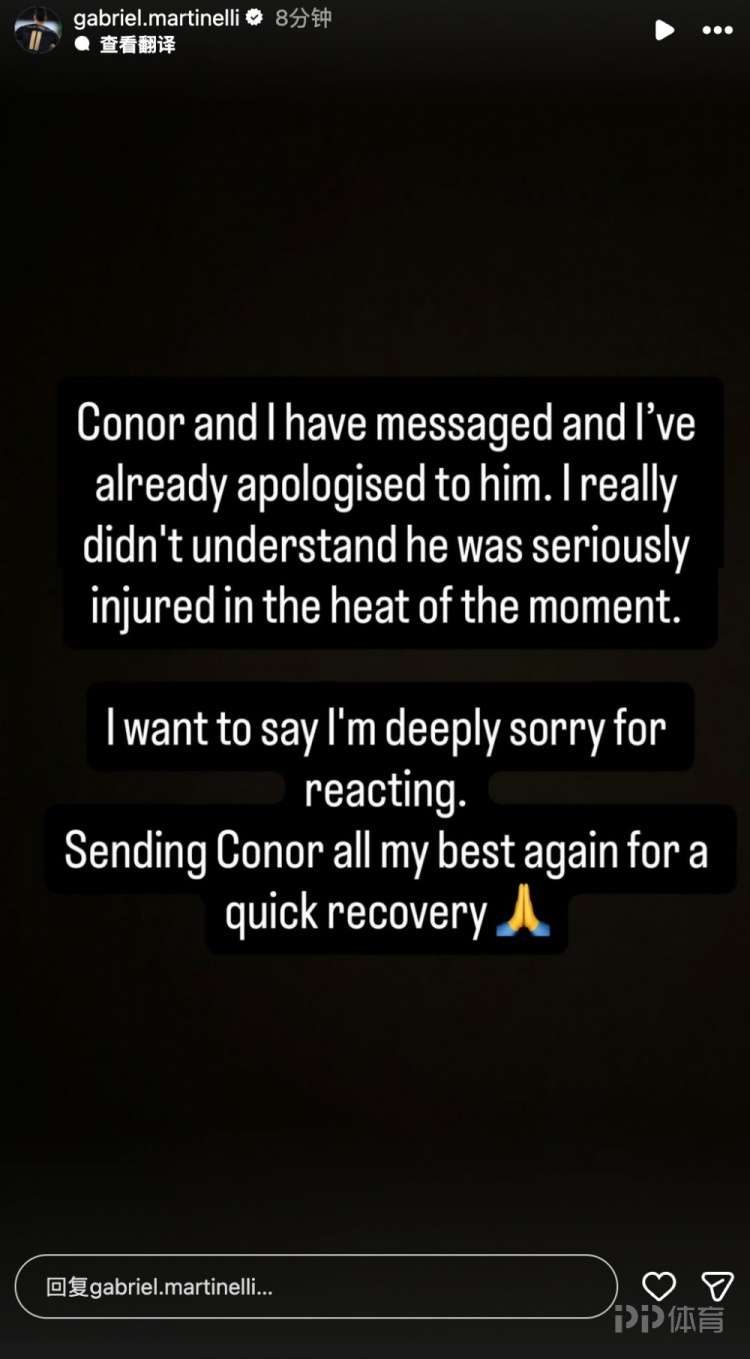 英超第21輪,阿森納主場(chǎng)0比0戰(zhàn)平利物浦。比賽中,布拉德利無對(duì)抗下倒地,隨后馬丁內(nèi)利用球砸向他,并試圖將其推出場(chǎng)外,這一行為引發(fā)雙方?jīng)_突。賽后馬丁內(nèi)利通過社交媒體發(fā)文致歉,表示自己當(dāng)時(shí)并沒有意識(shí)到布拉德利受到重傷,并祝愿其早日康復(fù)。