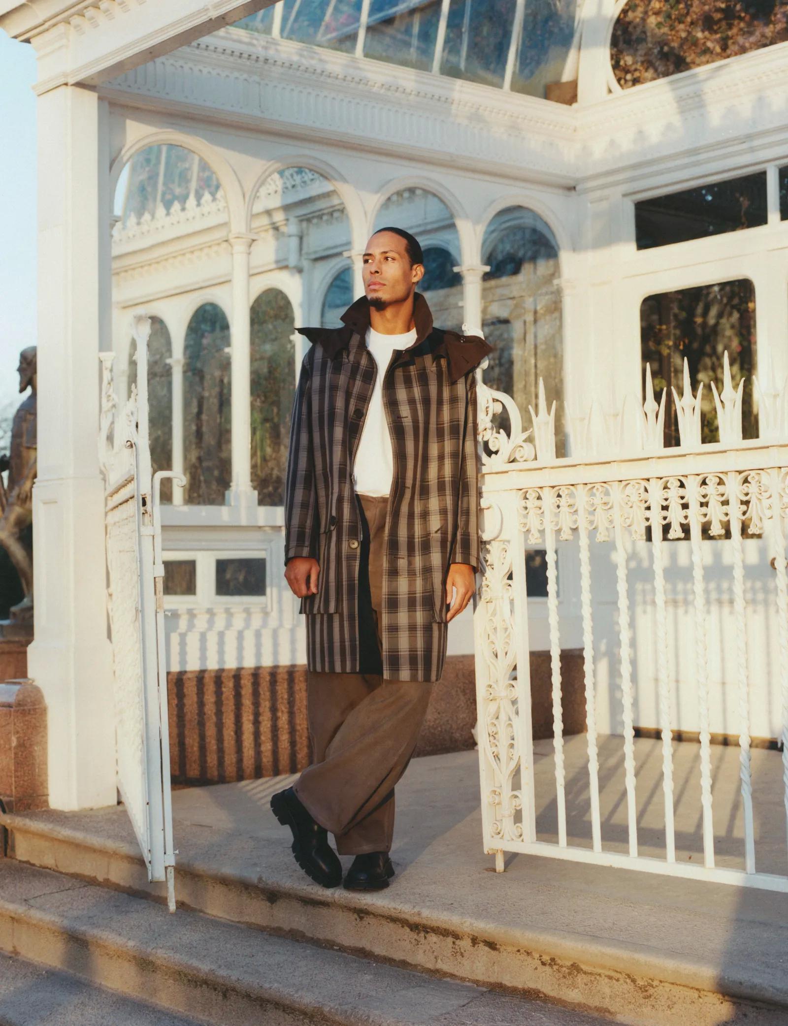通常是被稱為“大維吉”的范戴克讓別人顯得渺小。身高1米93的他,被認為是英超最具威懾力的中后衛(wèi)之一,球迷推崇他在防守中輕松貼防并限制頂級前鋒的能力,包括姆巴佩、哈蘭德和凱恩。在拍攝現(xiàn)場,他同樣顯得游刃有余。身穿愛馬仕格紋服裝仰頭迎接冬日最后的陽光,換上Sacai米色套裝跨坐在椅子上直視鏡頭,腳踩Jacquemus運動鞋,伴隨Omah Lay的音樂輕輕起跳。談及鏡頭前的從容,34歲的范戴克表示:這里的環(huán)境讓所有人都能放松下來,希望最終呈現(xiàn)的效果會很好。