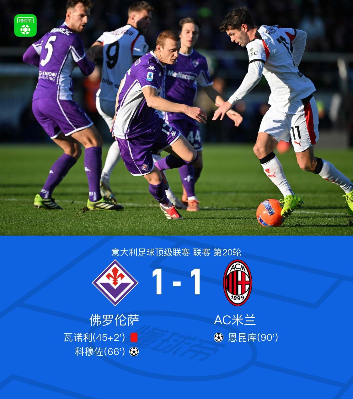 北京時間1月11日意大利足球頂級聯(lián)賽 聯(lián)賽 第20輪,佛羅倫薩主場對陣AC米蘭。上半場佛羅倫薩主帥瓦諾利抗議判罰,裁判連出兩張黃牌將其罰出場。下半場古德蒙德松開出角球,科穆佐頭球破門,比賽尾聲福法納送助攻,恩昆庫爆射破門。最終米蘭客場1-1戰(zhàn)平佛羅倫薩。