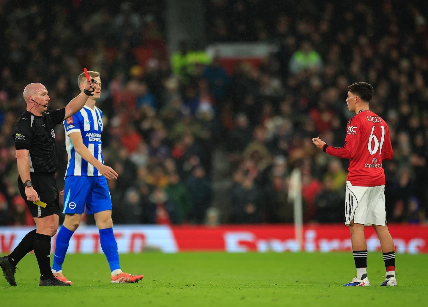 足總杯第三輪,曼聯(lián)主場(chǎng)1-2不敵布萊頓,此役替補(bǔ)染紅的18歲小將謝伊-萊西賽后更新社交媒體道歉。
