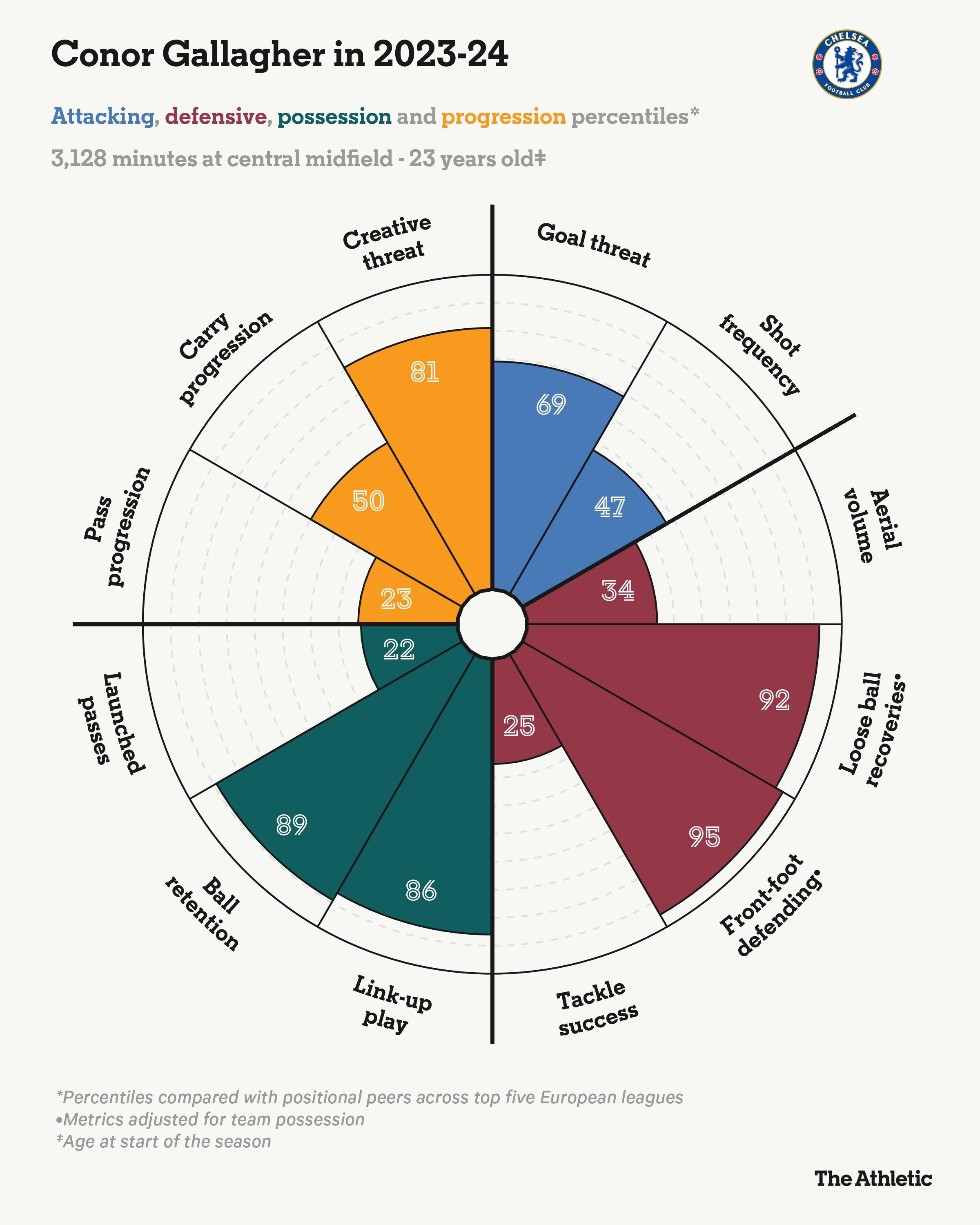 雖然他并非這支球隊(duì)所需的推進(jìn)性傳球手,但加拉格爾在切爾西最后一個(gè)賽季的球員雷達(dá)圖顯示他具備有用的特質(zhì)。在一個(gè)注重快速攻擊和轉(zhuǎn)換的球隊(duì)中,他在創(chuàng)造力威脅、持球和銜接配合方面排名靠前,同時(shí)在37場聯(lián)賽中攻入5球并助攻7次。