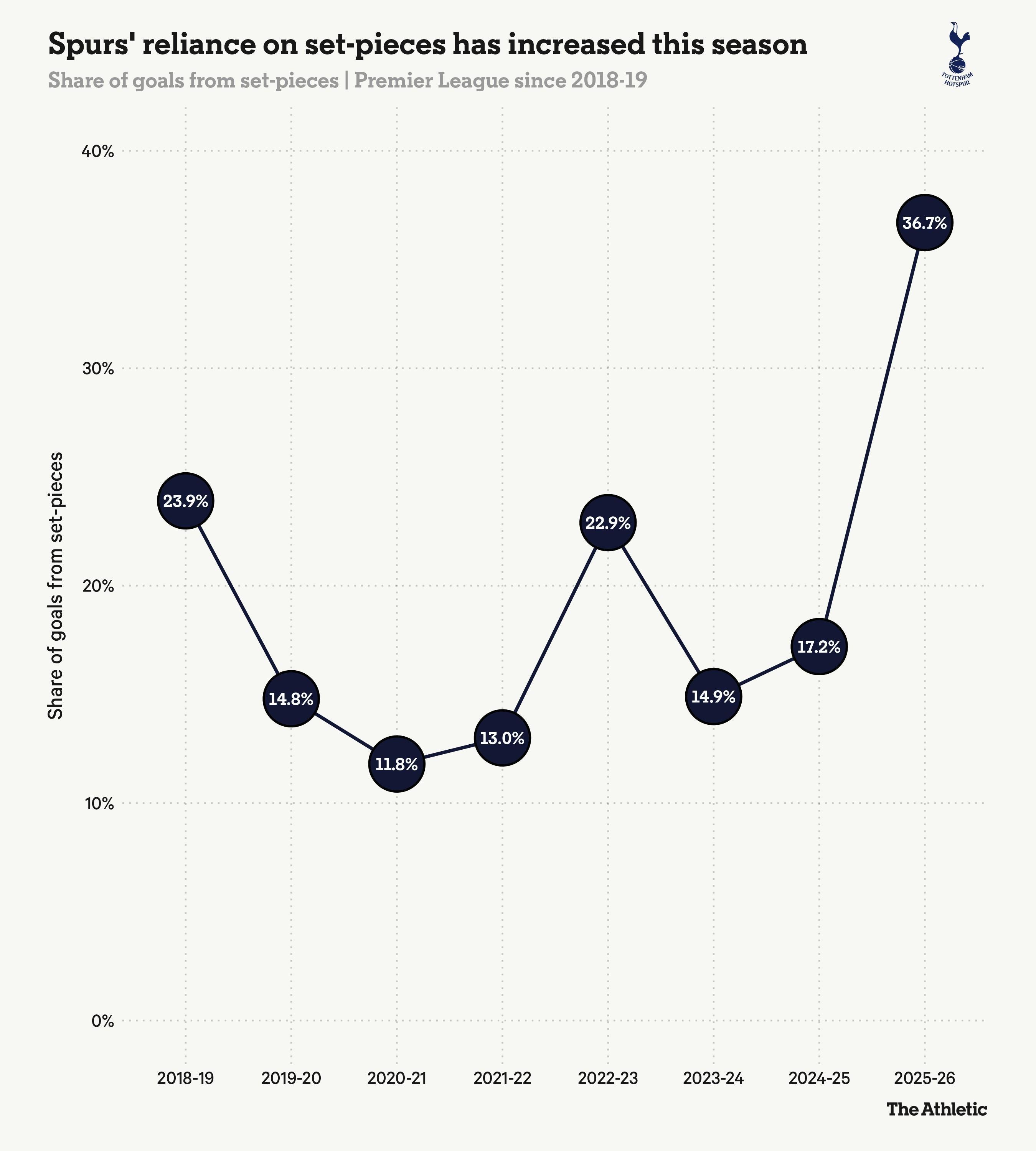 如下圖所示,這是熱刺八年來對定位球最為依賴的一個(gè)賽季。