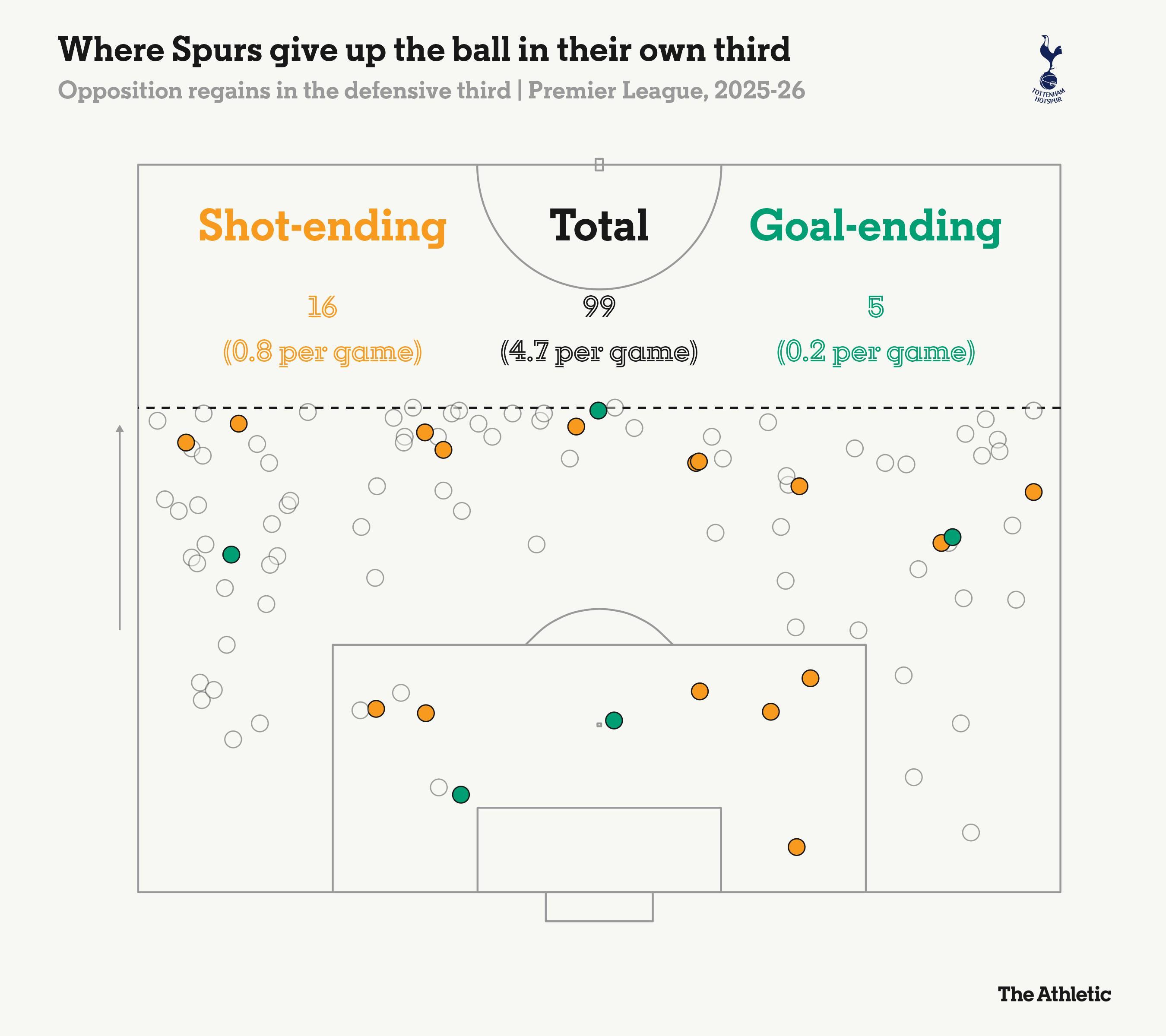 然而,2024-25賽季的一些不良習(xí)慣依然存在。他們已出現(xiàn)25次導(dǎo)致射門或失球的失誤,照此趨勢將超過去賽季的41次;他們場均在防守三區(qū)丟失球權(quán)4.7次,在聯(lián)賽中僅好于維拉(5.2次)排名倒數(shù)第二;并且他們已因此類失誤失球5次,與僅積7分排名英超墊底的狼隊(duì)并列最多。