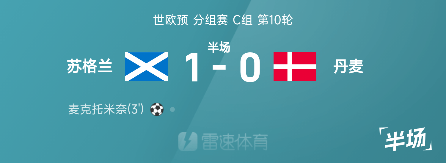 雷速體育11月19日訊 26賽季世歐預(yù)分組賽C組第10輪,蘇格蘭迎戰(zhàn)丹麥。半場(chǎng)戰(zhàn)罷,雙方比分暫為蘇格蘭1-0丹麥,麥克托米奈破門建功。