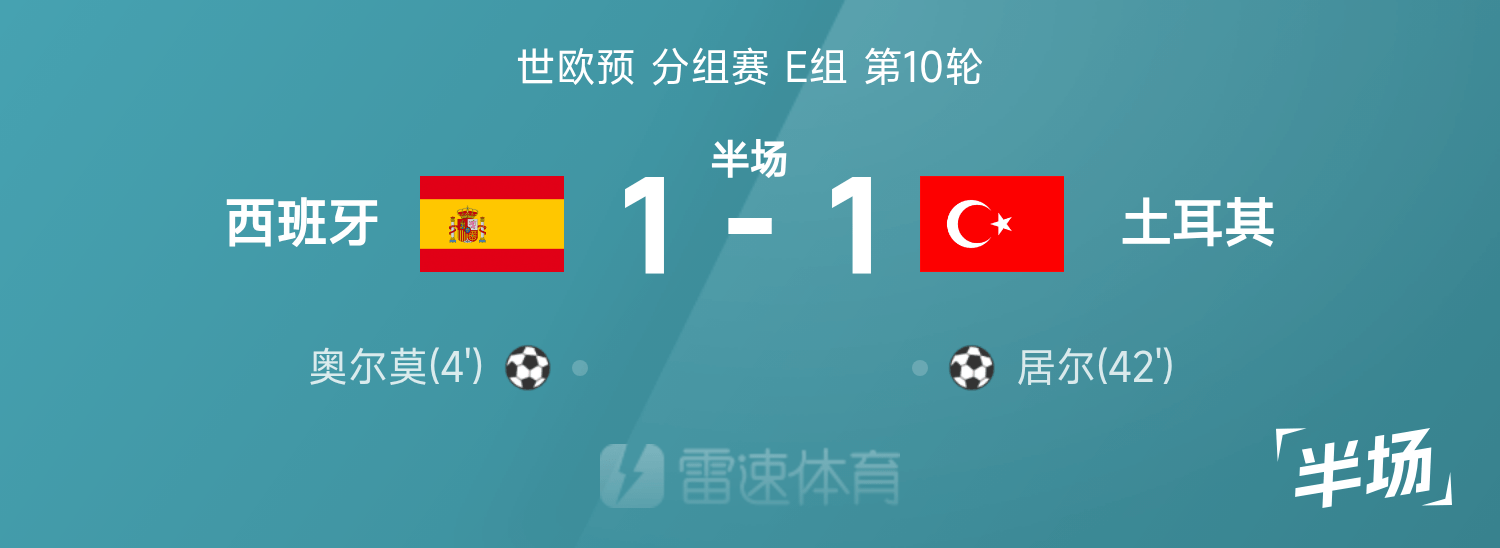 雷速體育11月19日訊 26賽季世歐預(yù)分組賽E組第10輪,西班牙迎戰(zhàn)土耳其。半場戰(zhàn)罷,雙方比分暫為西班牙1-1土耳其,奧爾莫、居爾破門建功。