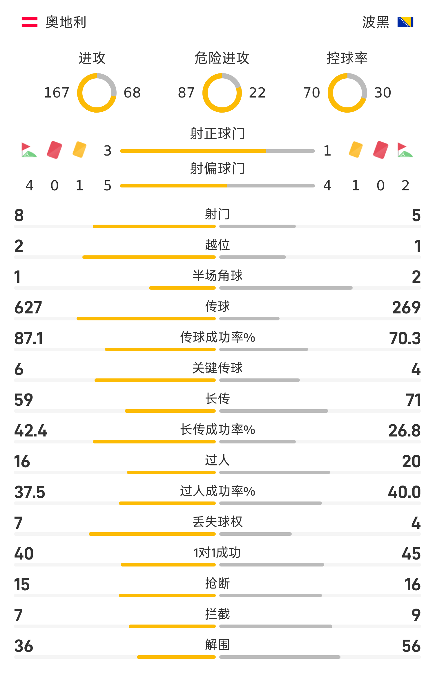 波黑首發(fā)陣容:1-瓦西爾吉、18-卡里克(71’2-穆賈基)、3-哈迪茲卡杜尼奇、4-穆哈雷莫維奇、23-馬利克(84’9-巴茲達(dá))、14-蘇季奇(84’21-阿拉杰貝戈維奇)、15-梅米奇、6-塔希羅維奇(84’16-哈德齊亞梅托維奇)、20-巴伊拉塔雷維奇、11-哲科、10-塔巴科維奇(63’8-吉戈維奇)