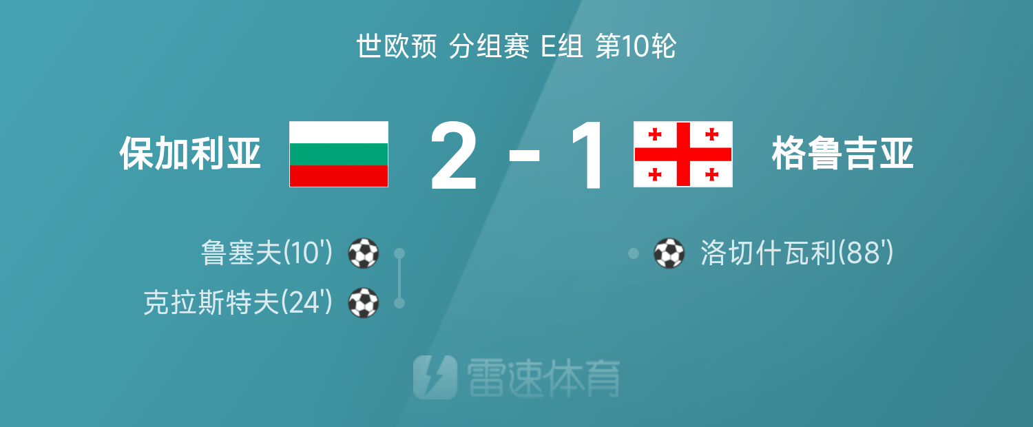 雷速體育11月19日訊 26賽季世歐預分組賽E組第10輪,保加利亞2-1戰(zhàn)勝格魯吉亞。上半場魯塞夫閃擊破門,克拉斯特夫再入一球擴大領先優(yōu)勢。下半場結(jié)束前,洛切什瓦利扳回一城。最終,保加利亞主場2-1戰(zhàn)勝格魯吉亞。