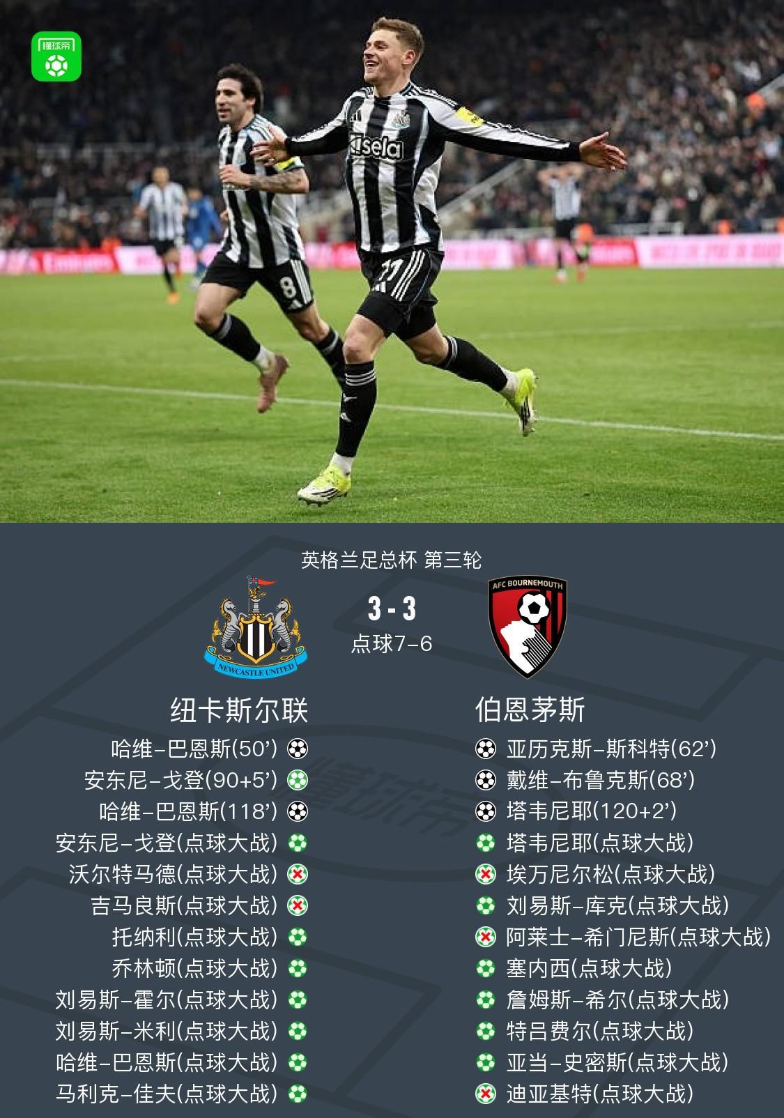 點球大戰(zhàn)紐卡總分10-9淘汰伯恩茅斯,巴恩斯雙響,戈登傳射