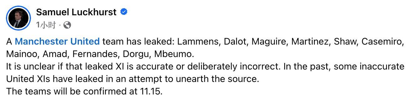 Samuel Luckhurst在公布這份首發(fā)時(shí)表示,目前尚不清楚這份泄露的首發(fā)名單是否正確。過(guò)去,曾有一些不正確的曼聯(lián)首發(fā)名單被提前泄露出來(lái),目的是找出其來(lái)源。