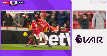 第81分鐘,VAR介入檢查諾丁漢森林球員手球,最后未予判罰