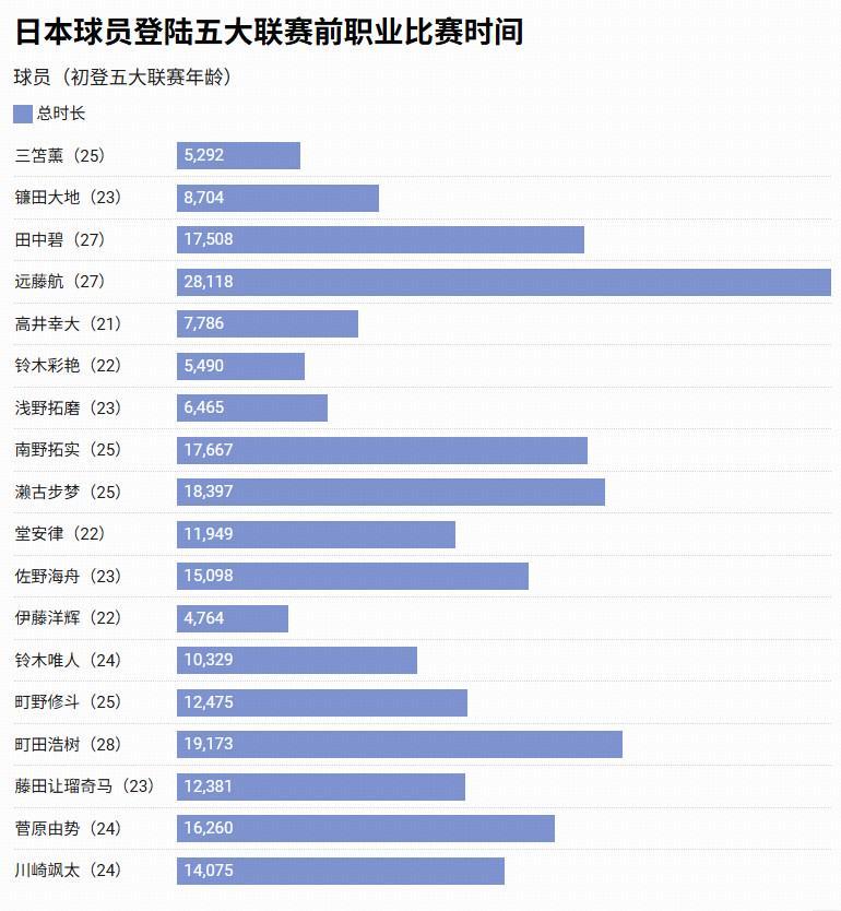 我們進一步總覽現(xiàn)役20名五大聯(lián)賽效力的日本球員,我們獲得了以下的數(shù)據(jù):登陸五大聯(lián)賽用時最少的是目前效力于拜仁的伊藤洋輝,總計在J聯(lián)賽踢了4764分鐘;耗時最多的是遠藤航,加盟斯圖加特前,他在 J 聯(lián)賽累計出戰(zhàn) 24107 分鐘,比甲出場 2120 分鐘,德乙征戰(zhàn) 1891 分鐘,在近 30000 分鐘的高強度比賽歷練后,時年 27 歲 8 個月的他才首次踏上五大聯(lián)賽賽場。