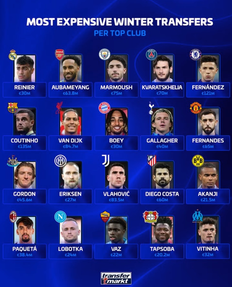 北京時(shí)間1月19日,德轉(zhuǎn)列出了歐洲五大聯(lián)賽20大俱樂部各自隊(duì)史的冬窗最貴引援,巴塞羅那1.35億歐元引進(jìn)庫蒂尼奧高居第一,切爾西1.21億歐元引進(jìn)恩佐-費(fèi)爾南德斯第二,利物浦8470萬歐元引進(jìn)范戴克第三。