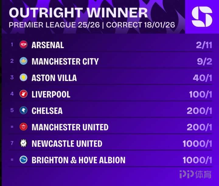 英超最新賠率:阿森納斷層領(lǐng)跑 曼城第2 維拉第3
