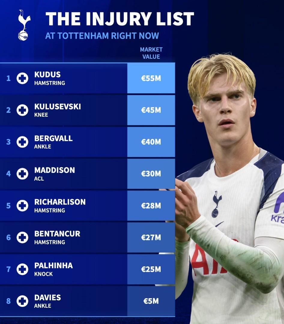 北京時間1月23日,在盧卡斯-貝里瓦爾腳踝受傷可能缺陣長達3個月之后,德轉(zhuǎn)列出了托特納姆熱刺目前的傷病名單,8名因傷高掛免戰(zhàn)牌的球員總身價達到了2.55億歐元。