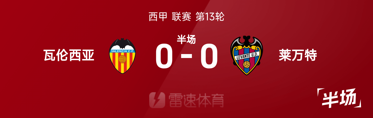 雷速體育11月22日訊 25/26賽季西甲聯(lián)賽第13輪,瓦倫西亞迎戰(zhàn)萊萬特。半場戰(zhàn)罷,雙方比分暫為瓦倫西亞0-0萊萬特。