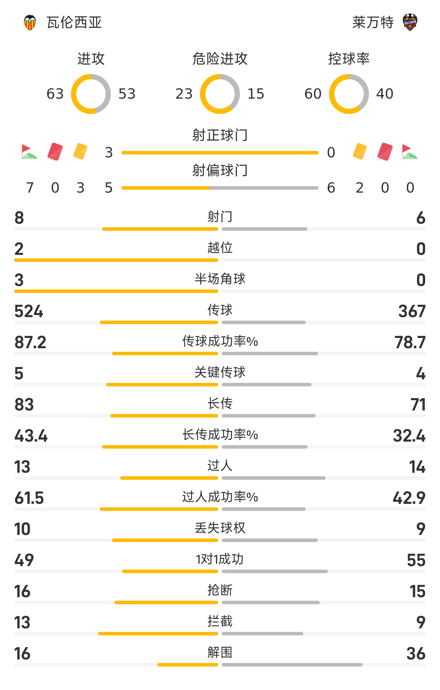 雷速體育11月22日訊 25/26賽季西甲聯(lián)賽第13輪,瓦倫西亞對(duì)陣萊萬(wàn)特。兩隊(duì)從一開(kāi)場(chǎng)就開(kāi)啟對(duì)攻,奧里奧率先勁射發(fā)難,蝙蝠中場(chǎng)格拉連續(xù)通過(guò)后插上在禁區(qū)內(nèi)制造威脅,但上半場(chǎng)均無(wú)建樹(shù)。易邊再戰(zhàn),第63分鐘,瓦倫西亞利用高空球制造機(jī)會(huì),洛佩斯門(mén)前包抄破門(mén)因科佩特越位在先被判進(jìn)球無(wú)效。第79分鐘,替補(bǔ)出場(chǎng)的杜羅用一記精彩倒鉤打破僵局,瓦倫西亞1-0領(lǐng)先萊萬(wàn)特。此后雙方再未改寫(xiě)比分,最終瓦倫西亞以1-0擊敗萊萬(wàn)特。