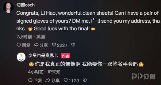 切赫今日現(xiàn)身李昊社媒評(píng)論區(qū)寫(xiě)道:“祝賀你李昊,精彩的零封!可以給我一雙你的簽名手套嗎?私聊我,我會(huì)給你我的地址,謝謝,決賽好運(yùn)!”