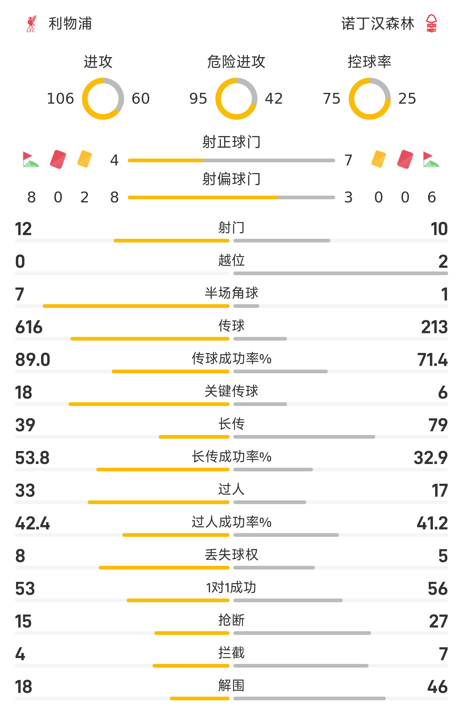 在這場比賽里,利物浦在射門(12-10)方面稍占優(yōu)勢;但在射正方面,則是諾丁漢森林以7-4占優(yōu),這也說明該隊在攻勢上更加具有威脅。在控球率方面,利物浦則是以75%-25%占據(jù)著壓倒性的優(yōu)勢。