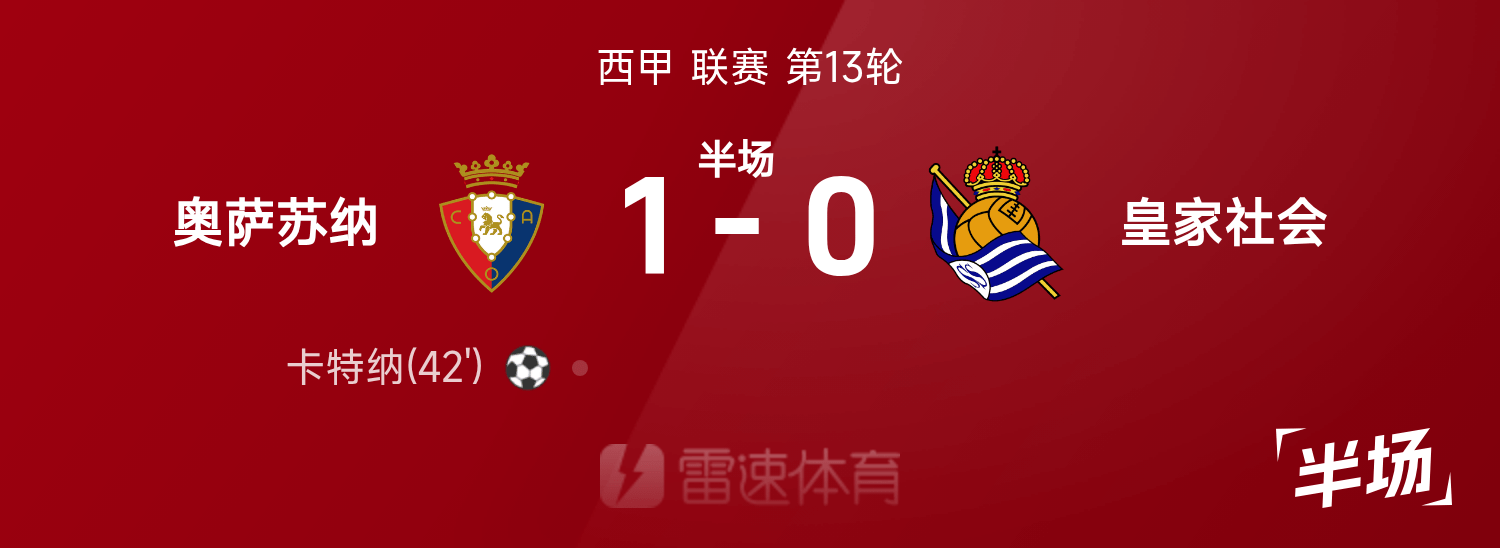 雷速體育11月23日訊 25/26賽季西甲聯(lián)賽第13輪,奧薩蘇納迎戰(zhàn)皇家社會。半場戰(zhàn)罷,雙方比分暫為奧薩蘇納1-0皇家社會,卡特納破門建功。
