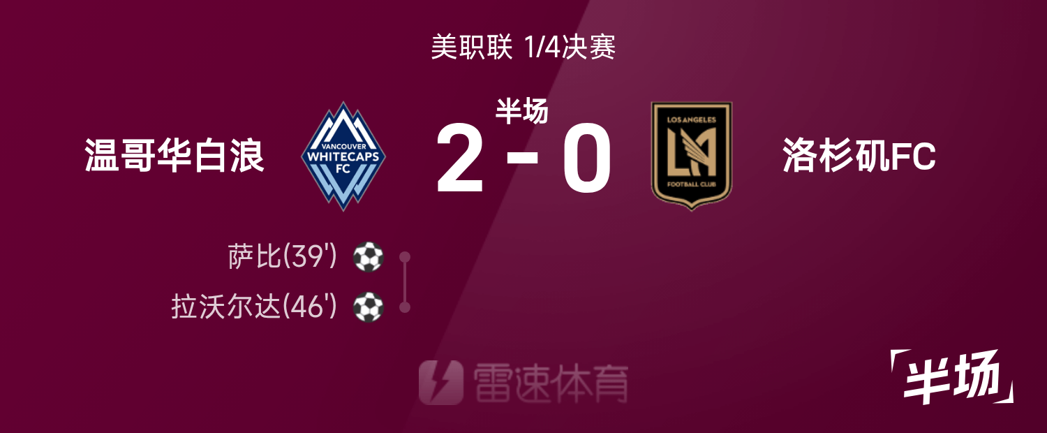 雷速體育11月23日訊 25賽季美職聯(lián)1/4決賽,溫哥華白浪迎戰(zhàn)洛杉磯FC。半場戰(zhàn)罷,雙方比分暫為溫哥華白浪2-0洛杉磯FC,拉沃爾達、薩比破門建功。