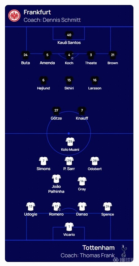 法蘭克福首發(fā):40-考阿-桑托斯、5-阿門達、4-科赫、3-阿蒂爾-蒂特、24-布塔、6-奧斯卡-霍伊倫、16-胡戈-拉松、21-納撒尼爾-布朗、15-斯希里、27-格策、7-克瑙夫