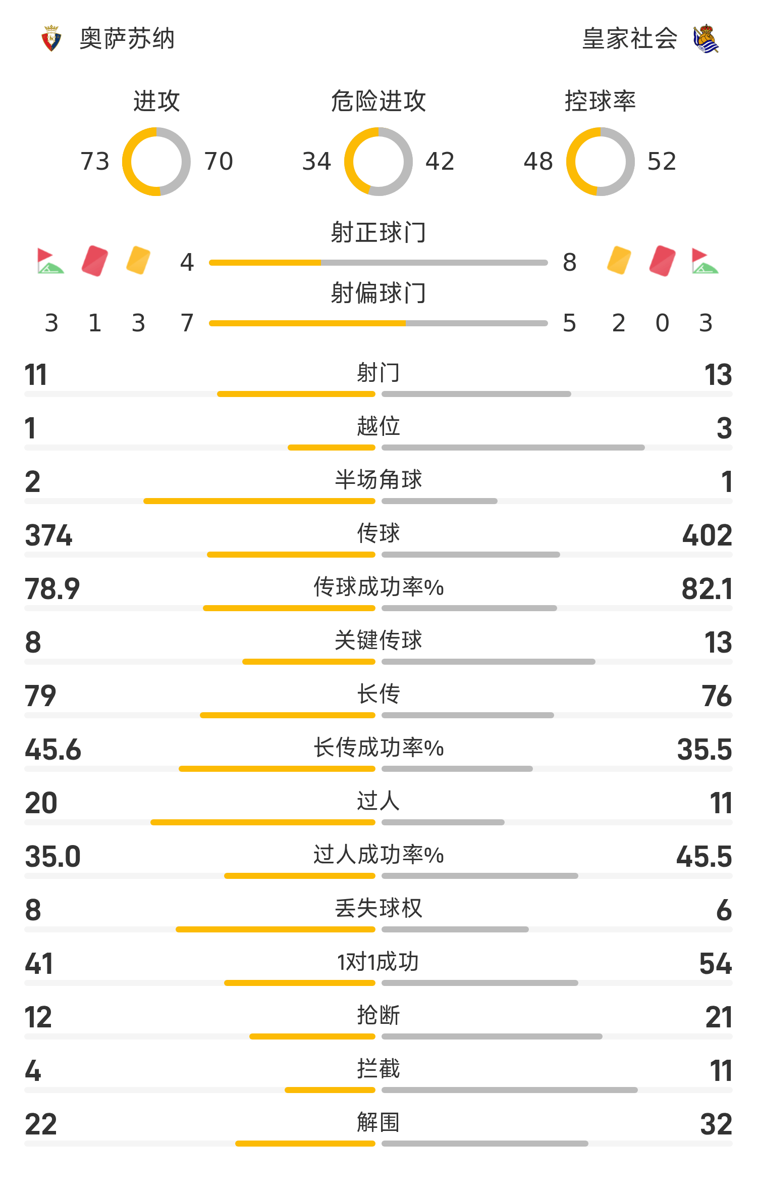 奧薩蘇納首發(fā)陣容:1-埃雷拉、3-克魯斯(61’14-R.加西亞)、24-卡特納、22-博約莫斯(78’5-赫蘭多)、16-戈麥斯(78’17-布迪米爾)、6-托羅、7-蒙卡約拉(71’41-吉比德)、23-布雷通、10-奧羅茲、9-加西亞、21-V.穆尼奧斯(78’11-巴爾哈)