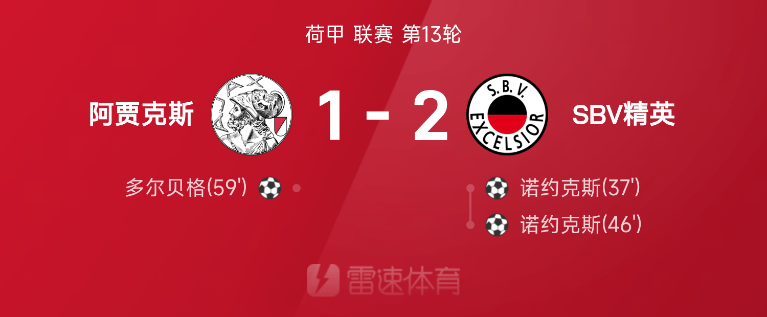 雷速體育11月23日訊 25/26賽季荷甲聯(lián)賽第13輪,SBV精英2-1戰(zhàn)勝阿賈克斯。全場比賽,諾約克斯上演梅開二度,多爾貝格破門難救主。