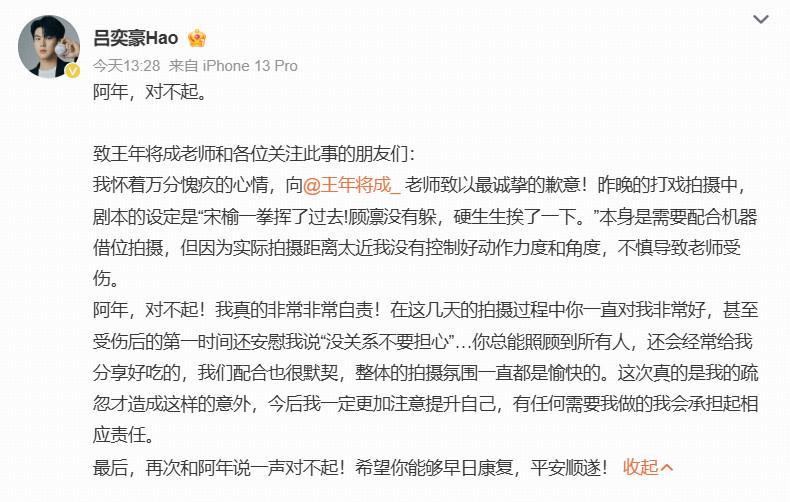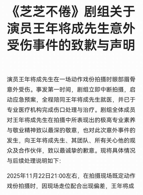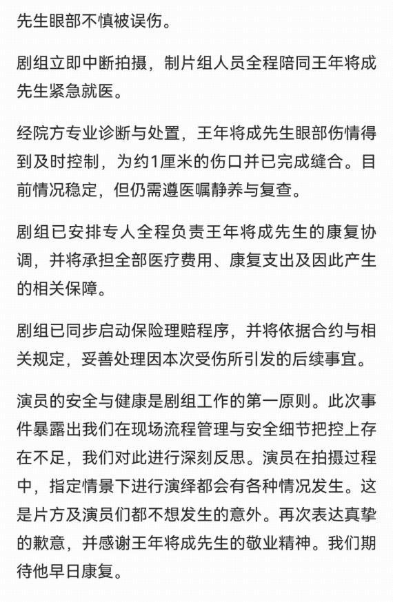 事后,對手演員也在社交媒體上表達(dá)了真誠道歉,劇組也發(fā)布聲明,表示已安排專人全程負(fù)責(zé)王年將成的康復(fù)協(xié)商,并將承擔(dān)全部醫(yī)療費用、康復(fù)支出及因此產(chǎn)生的相關(guān)保障。