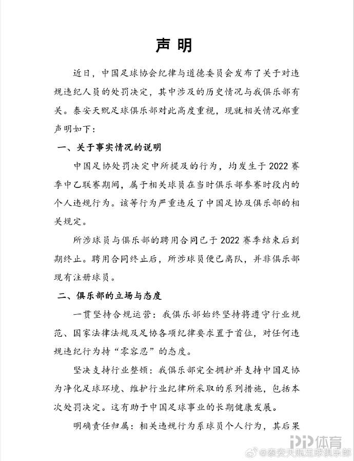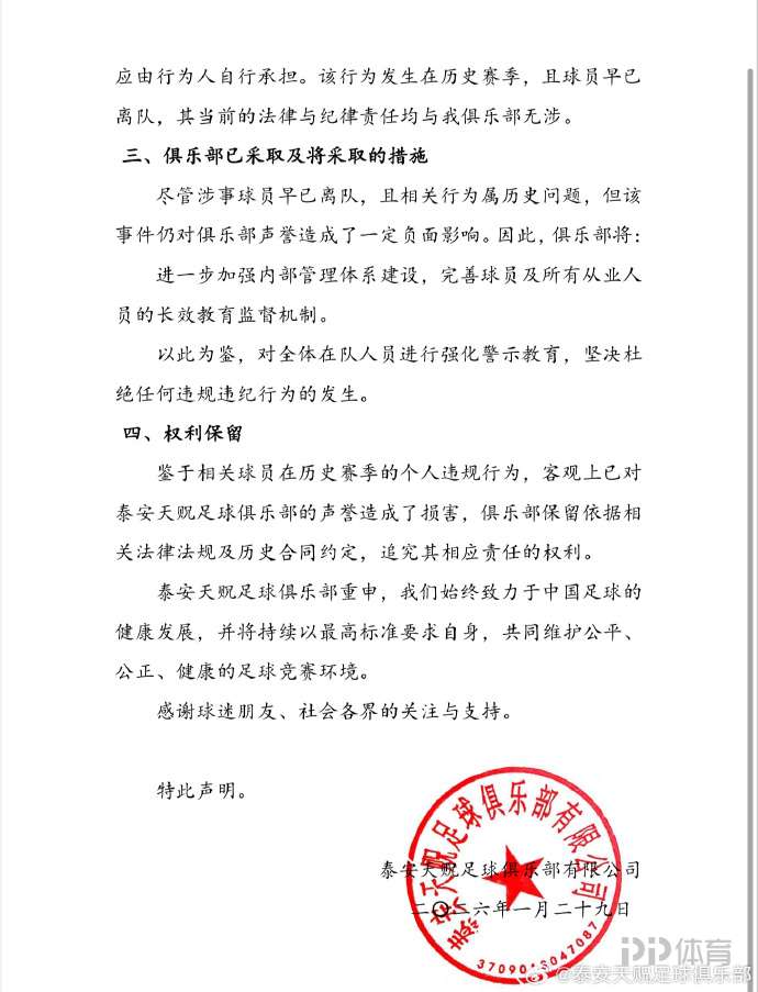 鑒于相關(guān)球員在歷史賽季的個(gè)人違規(guī)行為,客觀上已對(duì)泰安天貺足球俱樂部的聲譽(yù)造成了損害,俱樂部保留依據(jù)相關(guān)法律法規(guī)及歷史合同約定,追究其相應(yīng)責(zé)任的權(quán)利。