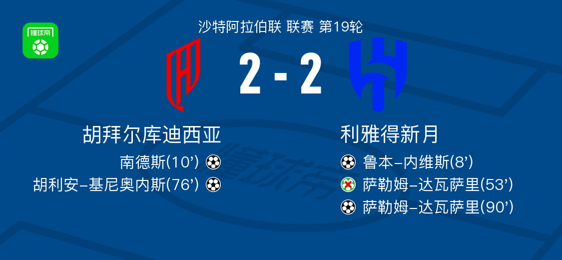 北京時(shí)間1月30日沙特阿拉伯聯(lián) 聯(lián)賽 第19輪,胡拜爾庫迪西亞主場(chǎng)對(duì)陣?yán)诺眯略隆:轄枎斓衔鱽喣系滤蛊崎T,胡利安-基尼奧內(nèi)斯破門。利雅得新月魯本-內(nèi)維斯破門,薩勒姆-達(dá)瓦薩里破門。最終比分胡拜爾庫迪西亞 2-2 利雅得新月。