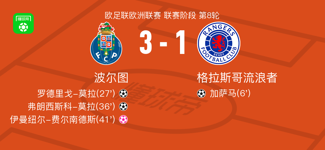 北京時(shí)間1月30日歐足聯(lián)歐洲聯(lián)賽 聯(lián)賽階段 第8輪,波爾圖對(duì)陣格拉斯哥流浪者。波爾圖羅德里戈-莫拉破門(mén),弗朗西斯科-莫拉破門(mén)。格拉斯哥流浪者加薩馬破門(mén),伊曼紐爾-費(fèi)爾南德斯自擺烏龍。最終比分波爾圖 3-1 格拉斯哥流浪者。