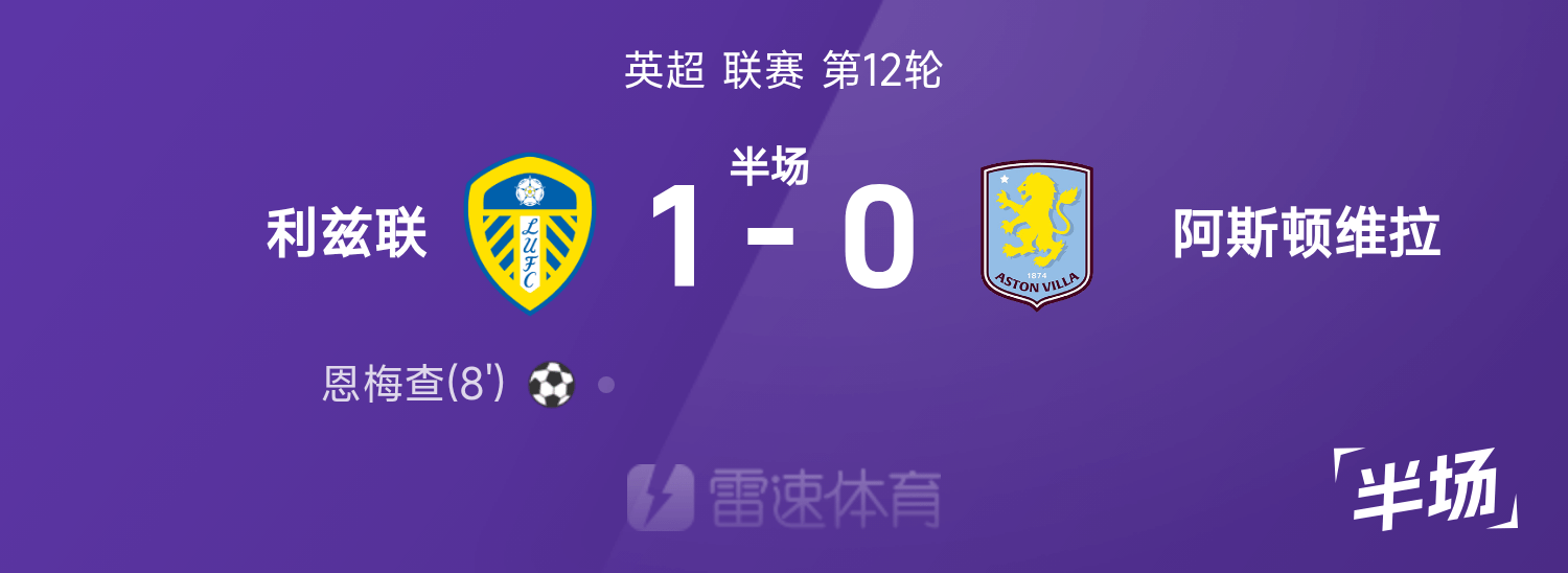 雷速體育11月23日訊 25/26賽季英超聯(lián)賽第12輪,利茲聯(lián)迎戰(zhàn)阿斯頓維拉。恩梅查破門經(jīng)VAR認(rèn)定有效,布恩迪亞任意球制造威脅,沃特金斯遠(yuǎn)射造險。半場戰(zhàn)罷,雙方比分暫為利茲聯(lián)1-0阿斯頓維拉。