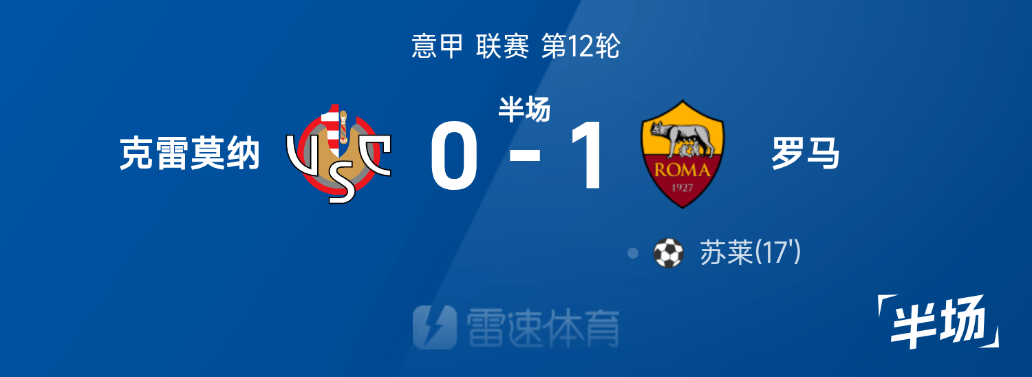 雷速體育11月23日訊 25/26賽季意甲聯(lián)賽第12輪,克雷莫納迎戰(zhàn)羅馬。半場戰(zhàn)罷,雙方比分暫為克雷莫納0-1羅馬,蘇萊破門建功。
