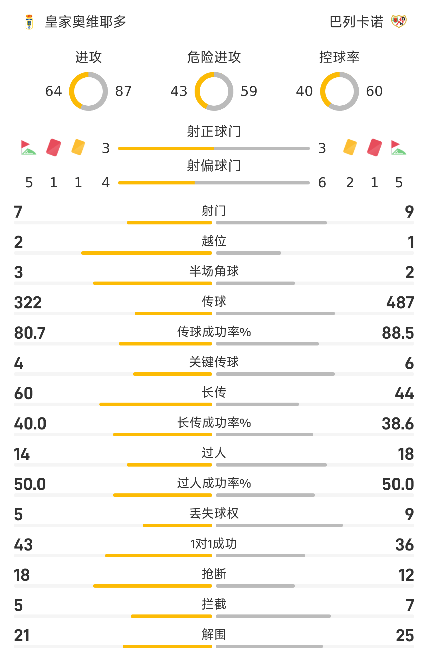 雷速體育11月23日訊 25/26賽季西甲聯(lián)賽第13輪,十人皇家奧維耶多0-0互交白卷悶平十人巴列卡諾。全場比賽,卡索拉、洛佩茲遠射中柱,凱拉剪刀腿飛鏟染紅,德弗魯托斯造點,帕拉松主罰點球被埃斯坎德利撲出,西塞最后時刻肘擊染紅。