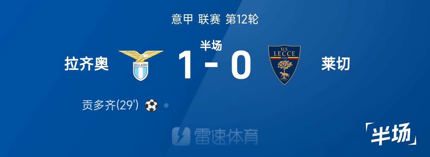 雷速體育11月24日訊 25/26賽季意甲聯(lián)賽第12輪,拉齊奧迎戰(zhàn)萊切。半場戰(zhàn)罷,雙方比分暫為拉齊奧1-0萊切,貢多齊破門建功。