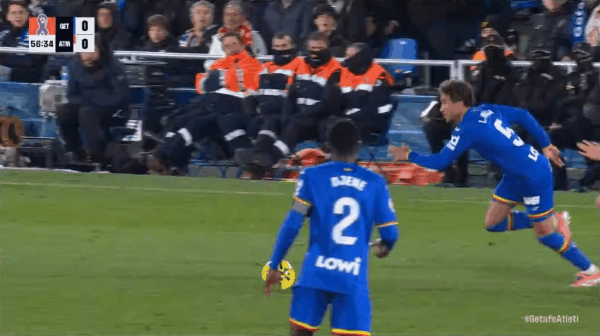 37’赫塔菲本場第一腳打門,馬約拉爾頭球攻門,皮球被穆索沒收