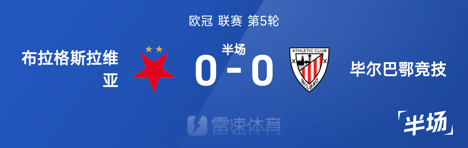 雷速體育11月26日訊 25/26賽季歐冠聯(lián)賽第5輪,布拉格斯拉維亞迎戰(zhàn)畢爾巴鄂競(jìng)技。半場(chǎng)戰(zhàn)罷,雙方比分暫為布拉格斯拉維亞0-0畢爾巴鄂競(jìng)技。