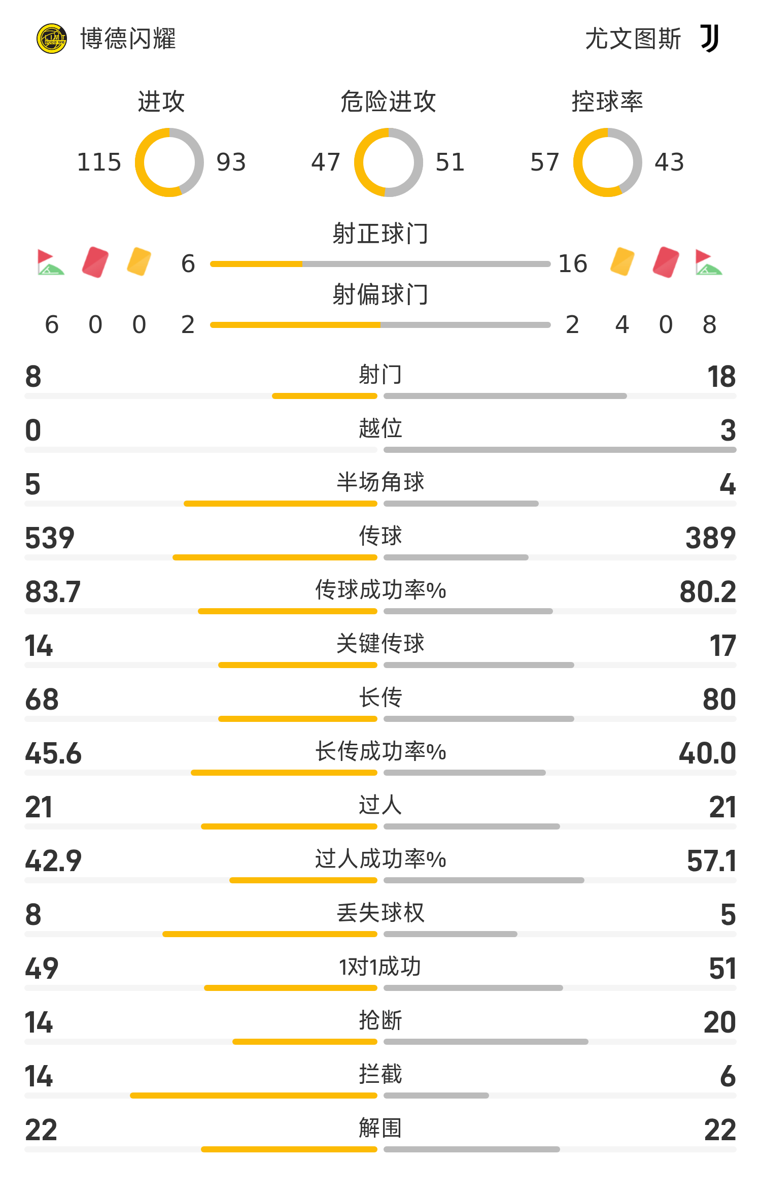 雷速體育11月26日訊 25/26賽季歐冠聯(lián)賽第5輪,尤文圖斯3-2戰(zhàn)勝博德閃耀。上半場(chǎng)第27分鐘,布隆伯格破門,幫助博德閃耀取得領(lǐng)先。易邊再戰(zhàn),奧彭達(dá)以及麥肯尼先后取得進(jìn)球幫助尤文反超比分。第87分鐘,菲特點(diǎn)球破門,幫助博德閃耀扳平比分。補(bǔ)時(shí)階段,戴維門前補(bǔ)射破門,完成絕殺,幫助尤文從客場(chǎng)成功帶走三分。